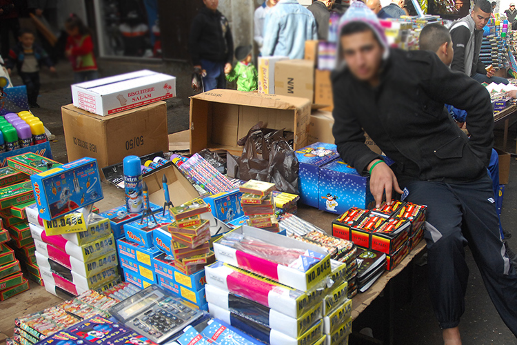 “من قال إن سوق “جامع ليهود” قاطع تجارة المفرقعات؟”، سؤال في شكل استغراب طرحه علينا أحد الباعة الشباب بمجرد أن سمع تعليقنا عن تفاجئنا بأعداد الطاولات المملوءة بشتى أنواع المفرقعات.
