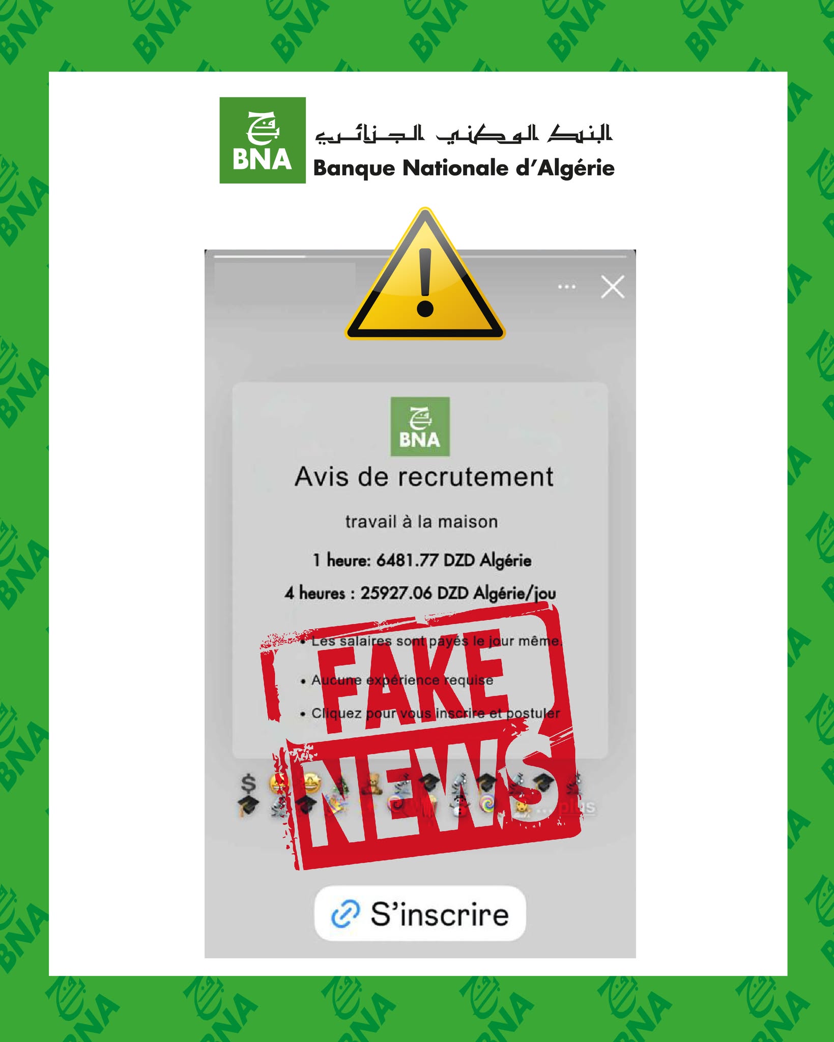 حذّر البنك الوطني الجزائري (BNA)، اليوم الأربعاء، من انتشار إعلانات توظيف مزيفة يتم تداولها عبر مواقع التواصل الاجتماعي، مؤكدًا أن هذه الإعلانات لا تمت بصلة للمؤسسة ولا تعكس أي عملية توظيف رسمية.