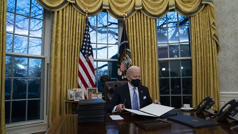 الرئيس الأمريكي جو بايدن يوقع سلسلة من الأوامر التنفيذية في يومه الأول بالبيت الأبيض في العاصمة واشنطن يوم 20 جانفي 2021