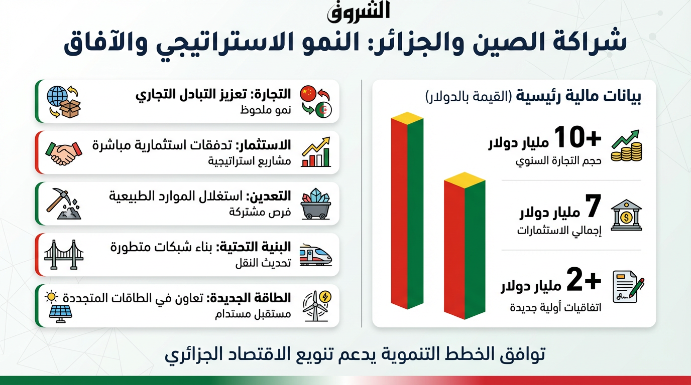 ويفتح توافق الخطط التنموية بين الصين والخطة الخمسية الخامسة عشر، وأهداف “الجزائر الجديدة”، آفاقًا لتعميق الشراكة، مع دعم جهود الجزائر في تنويع اقتصادها، خصوصًا في صناعة السيارات، التعدين، والرقمنة.