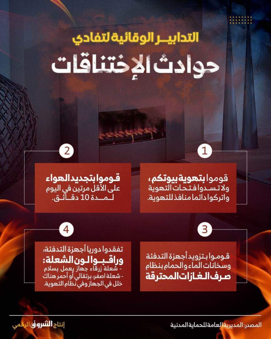 مع تزايد حوادث الإختناقات، إليكم بعض التدابير الوقائية التي يجب الإلتزام بها لحماية حياتكم منها:
