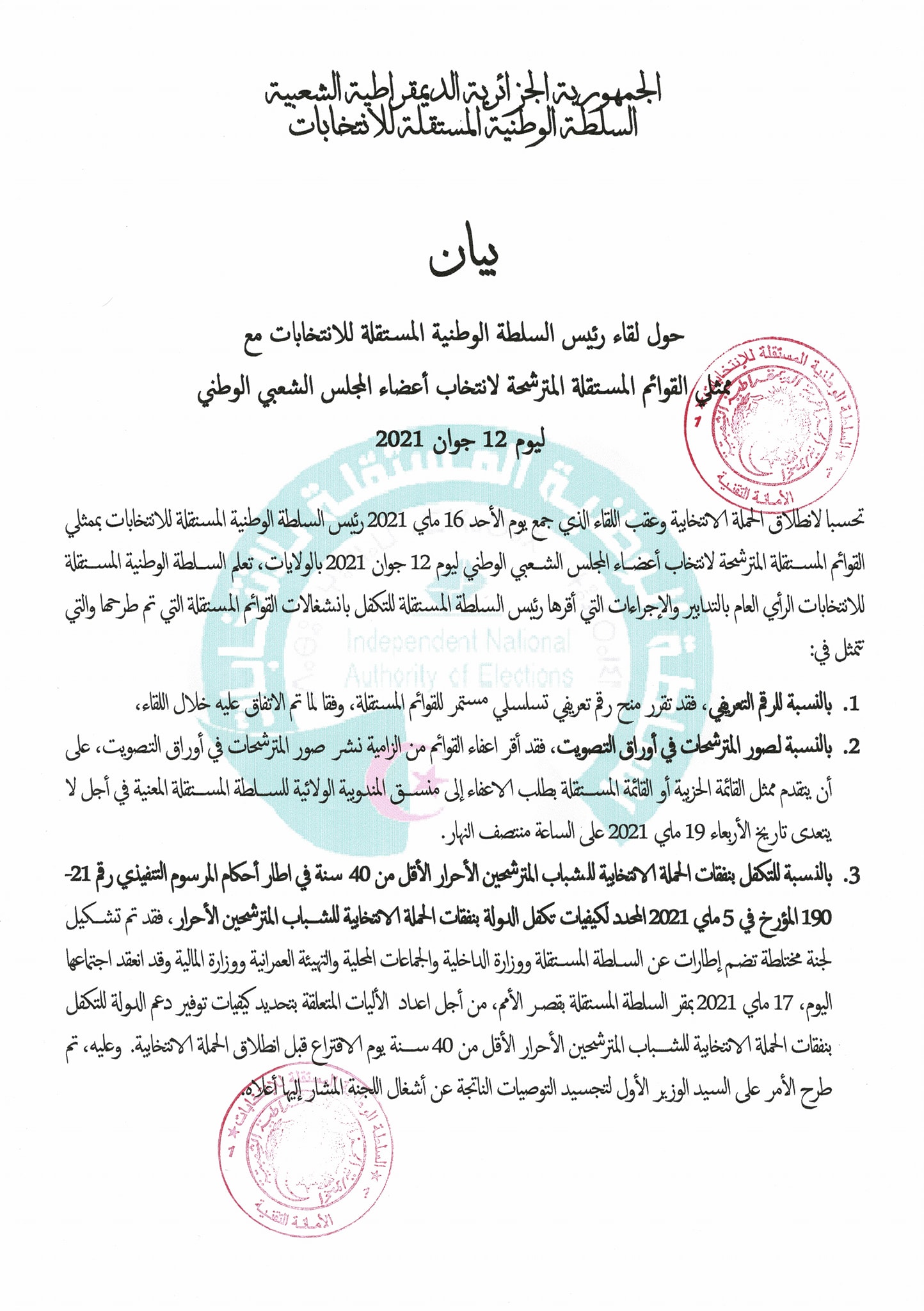 ونشرت السلطة بيانا عبر صفحتها الرسمية على موقع فيسبوك، جاء فيه أنه يمكن للمترشحات الامتناع عن نشر صورهن في أوراق التصويت شرط أن يتقدم ممثل القائمة الحزبية أو المستقلة بطلب الاعفاء إلى منسق المندوبية الولائية المعنية في أجل لا يتعدى منتصف نهار الأربعاء 19 ماي 2021.