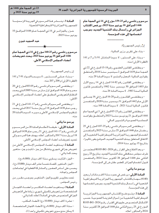 وجاء في الجريدة الرسمية في عددها الـ 38 بصفحتها الثامنة، نص المرسوم رقم 25-159، الموقّع من قبل رئيس الجمهورية عبد المجيد تبون بتاريخ 10 جوان 2025، أن مساهمة الجزائر ستُموَّل من أموال الخزينة العمومية.
