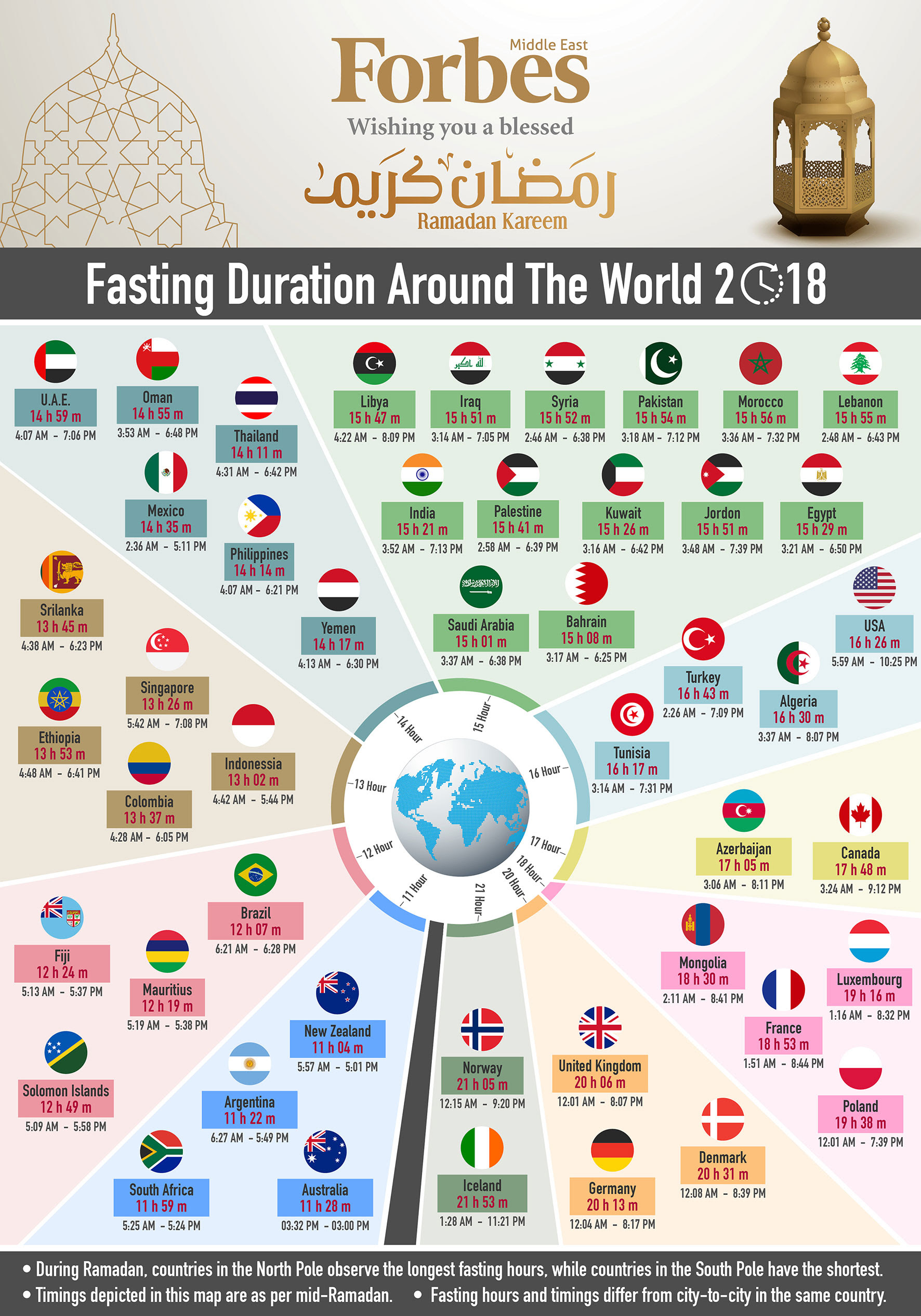 وذكرت مجلة “فوربس الشرق الأوسط) أن الدول الواقعة في النصف الشمالي من الكرة الأرضية ستشهد أطول ساعات صيام عن الدول الواقعة في النصف الجنوبي.