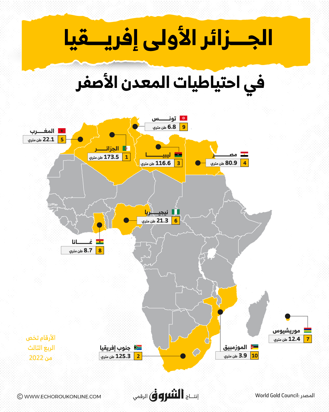 نعرض لكم في الإنفوجرافيك أدناه نظرة على ترتيب الدول الإفريقية وفقًا لمخزون الذهب في عام 2021..
