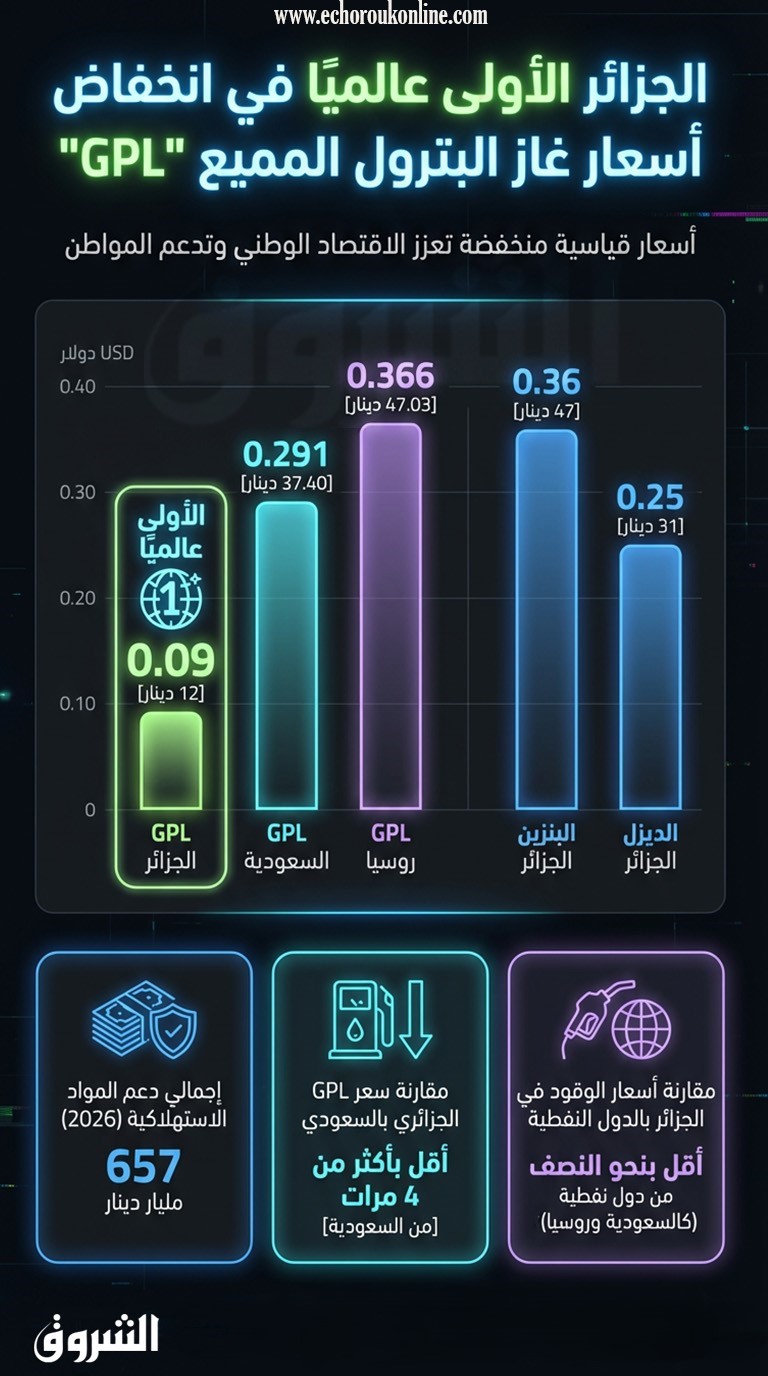 وبحسب قانون المالية لسنة 2026، خُصص غلاف مالي قدره 657 مليار دينار لدعم أسعار المواد واسعة الاستهلاك، بما فيها الوقود، وهو ما يفسر استمرار انخفاض أسعار غاز البترول المميع في الجزائر مقارنة بالأسواق العالمية.