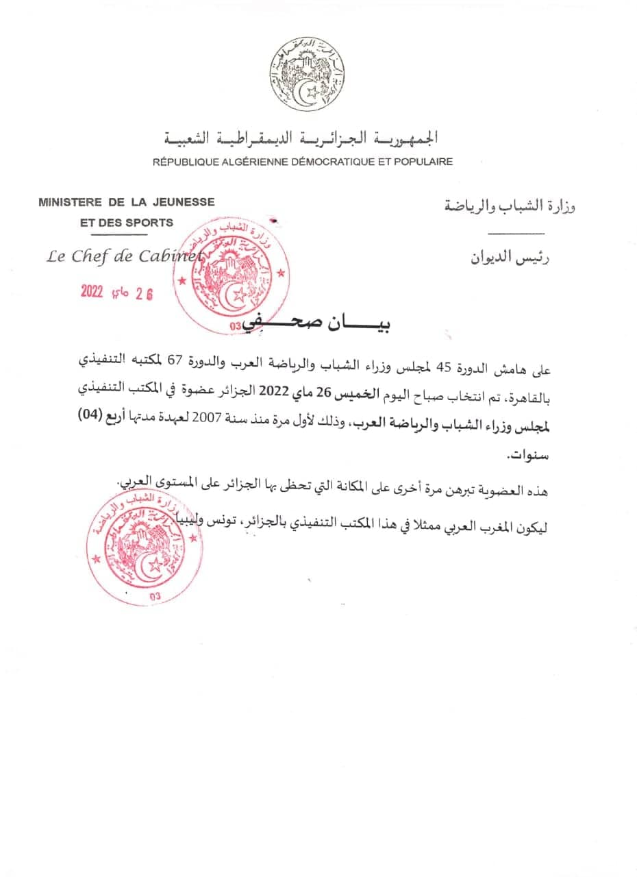 حازت الجزائر منصب العضوية في المكتب التنفيذي لِمجلس وزراء الشباب والرياضة العرب.