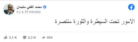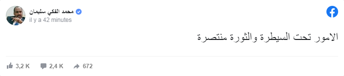 إلا أنه عاد وأضاف في تعليق لاحق:” الامور تحت السيطرة والثورة منتصرة”.