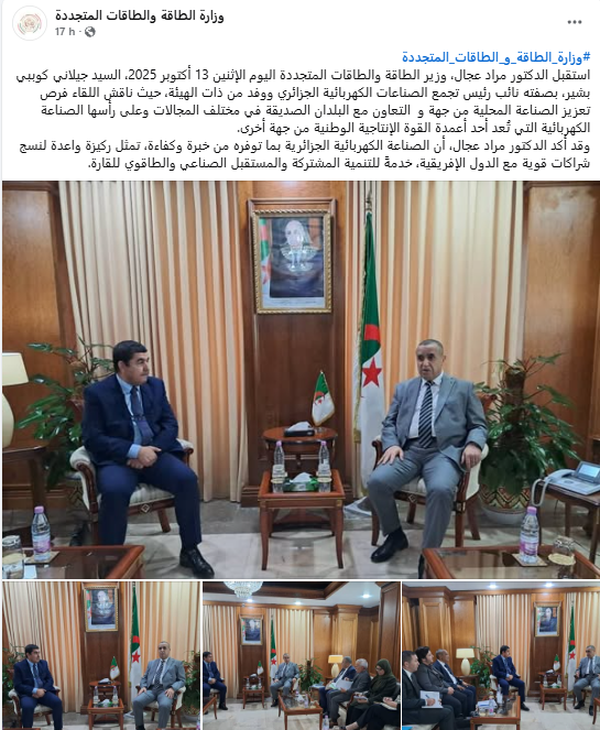 وبحث الطرفان فرص تطوير الشراكات الصناعية وتبادل الخبرات بين المؤسسات الجزائرية ونظيراتها الأجنبية، بما يساهم في دعم الاقتصاد الوطني وتنويع مصادر النمو الصناعي في قطاع الطاقات المتجددة والصناعات الكهربائية.