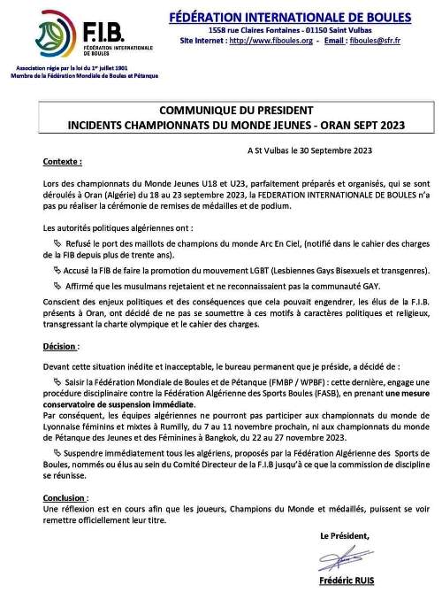 فضلا عن ذلك، جمّد الاتحاد الدولي لِرياضة الكرة الحديدية نشاط المسؤولين الجزائريين الذين يشغلون مناصب في هيئته. إلى غاية اجتماع لجنة الانضباط لاحقا، والفصل في هذه القضية.