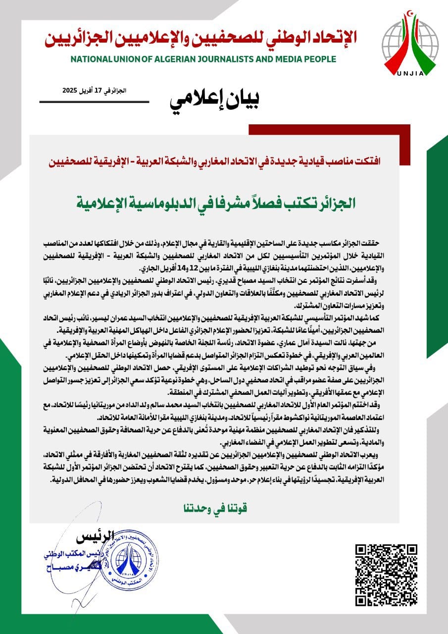 حققت الجزائر مكاسب جديدة على الساحتين الإقليمية والقارية في مجال الإعلام، بعد افتكاكها لعدة مناصب قيادية خلال المؤتمرين التأسيسيين لكل من الاتحاد المغاربي للصحفيين والشبكة العربية – الإفريقية للصحفيين والإعلاميين، اللذين احتضنتهما مدينة بنغازي الليبية في الفترة الممتدة من 12 إلى 14 أفريل 2025.