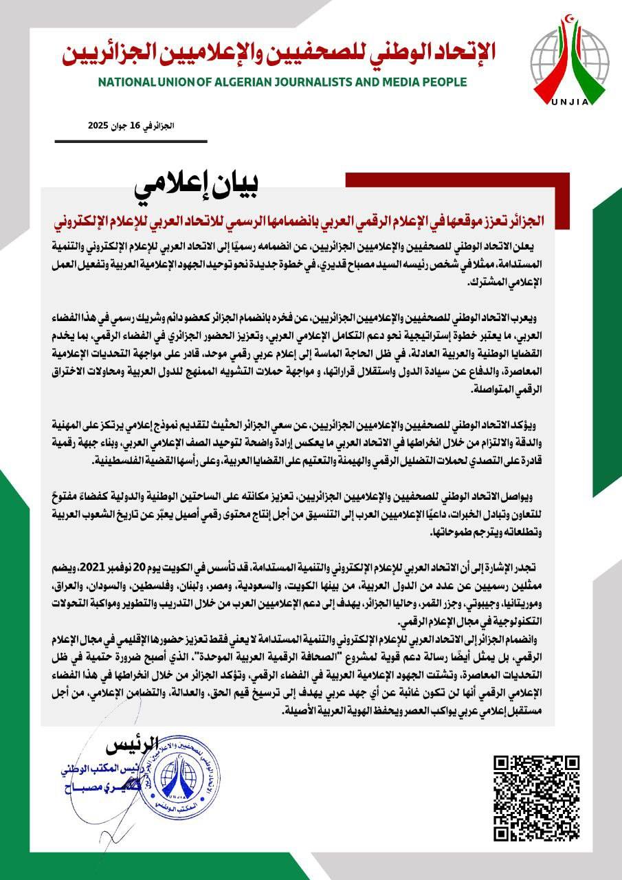 أعلن الاتحاد الوطني للصحفيين والإعلاميين الجزائريين، اليوم السبت، عن انضمامه الرسمي إلى الاتحاد العربي للإعلام الإلكتروني والتنمية المستدامة، ممثلاً برئيسه مصباح قديري، في خطوة تهدف إلى دعم العمل الإعلامي العربي المشترك وتوحيد الجهود في مواجهة التحديات الرقمية الراهنة.