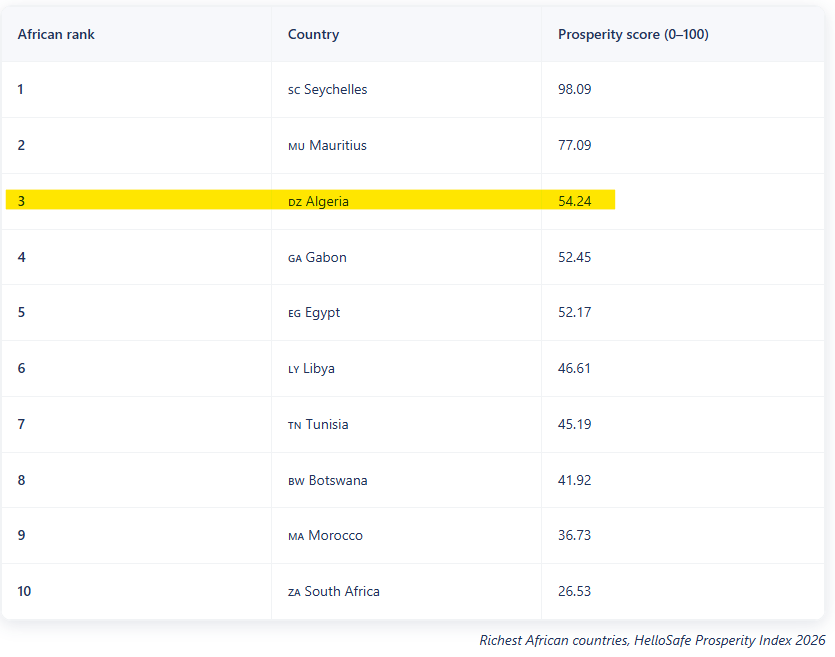 حلت الجزائر في المرتبة الثالثة ضمن قائمة أكثر الدول ازدهاراً في إفريقيا لعام 2026، وفق مؤشر “HelloSafe” الذي منحها 54.24 نقطة، خلف سيشيل المتصدرة بـ 98.09 نقطة وموريشيوس بـ 77.09 نقطة، استناداً إلى معايير تشمل الناتج المحلي الإجمالي، والدخل القومي، ومؤشر التنمية البشرية، وتوزيع الدخل ومستويات الفقر.