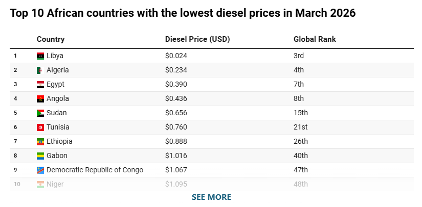 حافظت الجزائر على موقعها ضمن أرخص دول أفريقيا في أسعار الديزل لشهر مارس 2026، مقارنة بالأسعار العالمية، وفق بيانات حديثة نشرها موقع “آفريكا بيزنس إنسايدر” المتخصص، مسجلة انخفاضًا طفيفًا مقارنة بالشهر الماضي، في وقت شهدت فيه بعض الدول زيادات ملموسة نتيجة الضغوط على أسواق الطاقة العالمية.