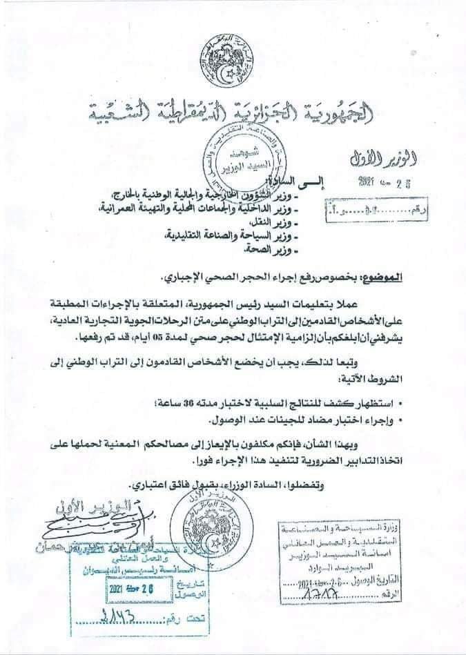 وأبرقت الوزارة الأولى تعليمة إلى 4 قطاعات وزارية بخصوص تدابير الحجر الصحي للوافدين من الخارج إلى الجزائر.