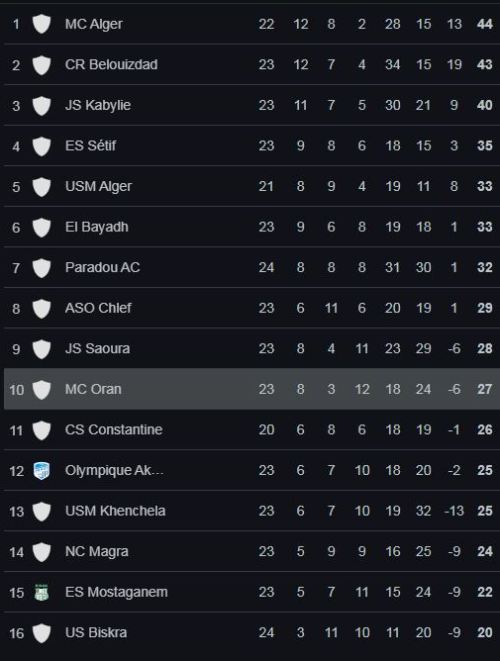 ولم تفز جمعية الشلف واتحاد بسكرة في آخر خمس مقابلات بِرسم البطولة.