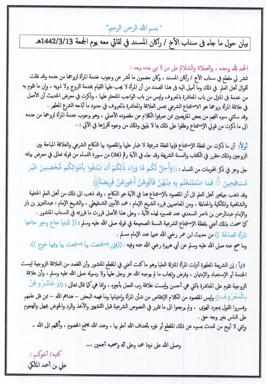 وتابع المالكي قائلا في بيانه: “إن الشريعة المطهرة أنزلت المرأة المنزلة العليا وهو ما كنت أعني في المقطع المنشور وأن القصد من العلاقة الزوجية ليست الخدمة أو الاستعباد أو الامتهان وفرض إيجاب ما لم يوجبه الله عز وجل ورسوله صل الله عليه وسلم..”