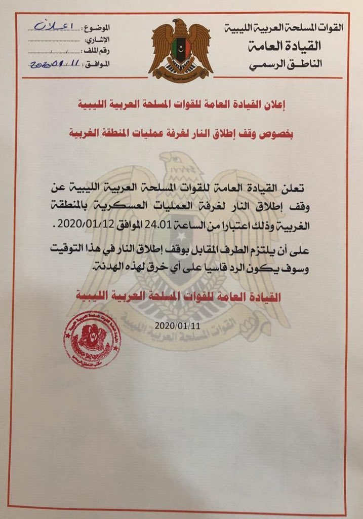وقال المسماري إن قواته تعلن عن وقف إطلاق النار في غرفة العمليات بالمنطقة الغربية اعتبارا من منتصف ليلة الأحد 12 يناير/كانون الثاني الجاري، على أن يلتزم الطرف المقابل بوقف إطلاق النار في هذا التوقيت، مشددا على أن الرد سيكون قاسيا على أي خرق لهذه الهدنة.