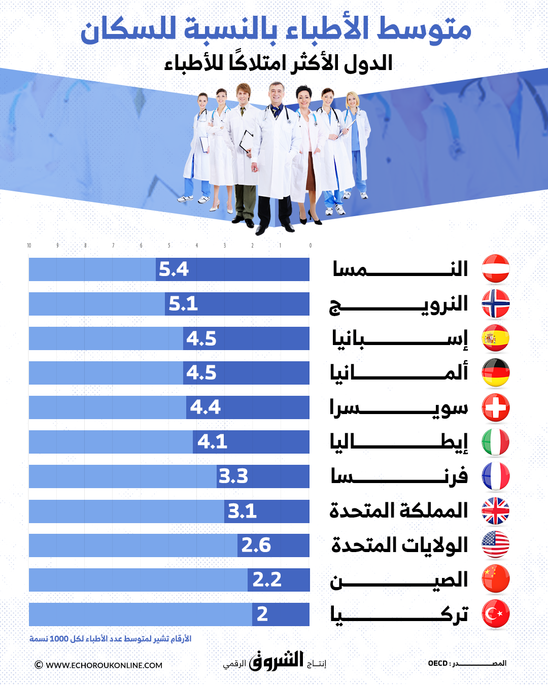 هذه هي الدول الأكثر امتلاكاً للأطباء في العالم (الأرقام تشير لمتوسط عدد الأطباء لكل 1000 نسمة):