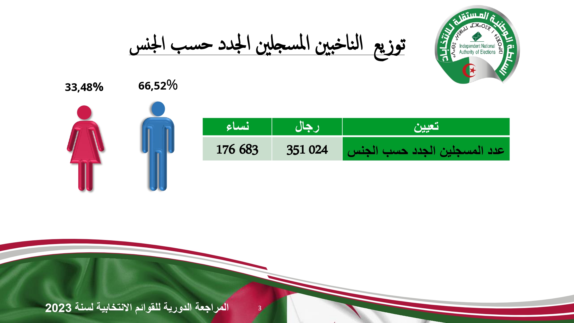 ويسيطر الذكور على الحصة الأكبر من تعداد الناخبين الجدد بنسبة 66.52 بالمئة (351.024 مسجّل). مقابل 33.48 بالمئة للإناث (176.683 مسجّلة).