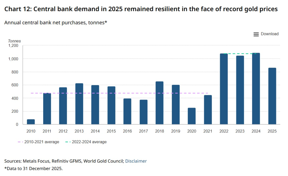 كما توقّع “جي بي مورغان” أن تبلغ مشتريات البنوك المركزية من الذهب نحو 800 طن في عام 2026، مرجعًا ذلك إلى الاتجاه المستمر نحو تنويع الاحتياطيات.