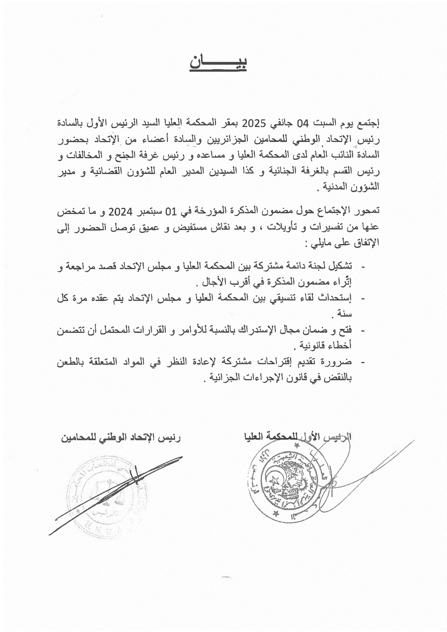 وتم تحديد العمل على هذا الملف في أقرب الآجال. كما تم الاتفاق على استحداث لقاء تنسيقي سنوي بين المحكمة العليا ومجلس الاتحاد.