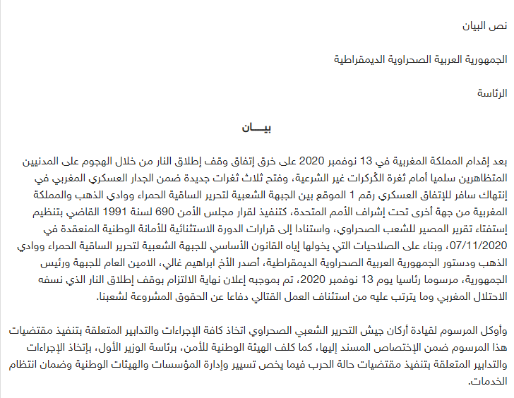 أعلن رئيس جمهورية الصحراء الغربية إبراهيم غالي، نهاية الالتزام بوقف إطلاق النار الموقع بين جبهة البوليساريو والمملكة المغربية سنة 1991.