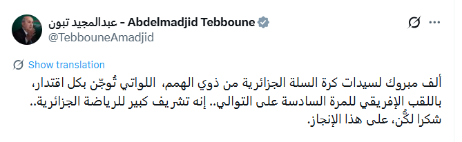 وجاء في تهنئة رئيس الجمهورية : “ألف مبروك لسيدات كرة السلة الجزائرية من ذوي الهمم، اللواتي تُوجّن بكل اقتدار، باللقب الإفريقي للمرة السادسة على التوالي.. إنه تشريف كبير للرياضة الجزائرية.. شكرا لكُّن، على هذا الإنجاز”.