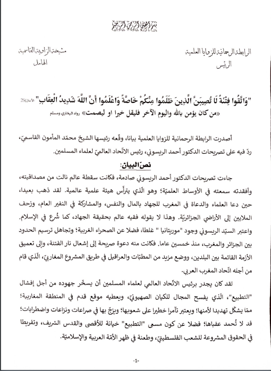 استنكرت الرابطة الرحمانية للزوايا العلمية، يرأسها الشيخ محمد المأمون القاسمي الحسني، الثلاثاء، التصريحات الخطيرة التي أدلى أحمد الريسوني، في خرجته الإعلامية الأخيرة، واعتبرتها تحريضا على الفتنة والاقتتال بين المسلمين.