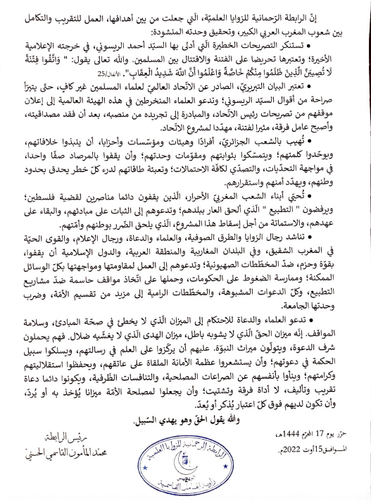 واعتبرت الرابطة “البيان التبريري الصادر عن الاتحاد العالمي لعلماء المسلمين غير كاف حتى تتبرأ صراحة من أقوال السيد الريسوني، وتدعو العلماء المنخرطين في هذه الهيئة العالمية إلى إعلان موقفهم من تصريحات رئيس الاتحاد، والمبادرة إلى تجريده من منصبه، بعد أن فقد مصداقيته وأصبح عامل فرقة، مثيرا لفتنة مهددا لمشروع الاتحاد”.
