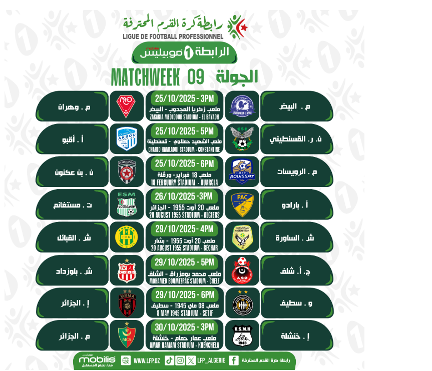 وتفتتح الجولة التاسعة بمباريات مولودية البيض ومولودية وهران، وشباب قسنطينة أمام أولمبيك أقبو، ومستقبل الرويسات أمام نجم بن عكنون.