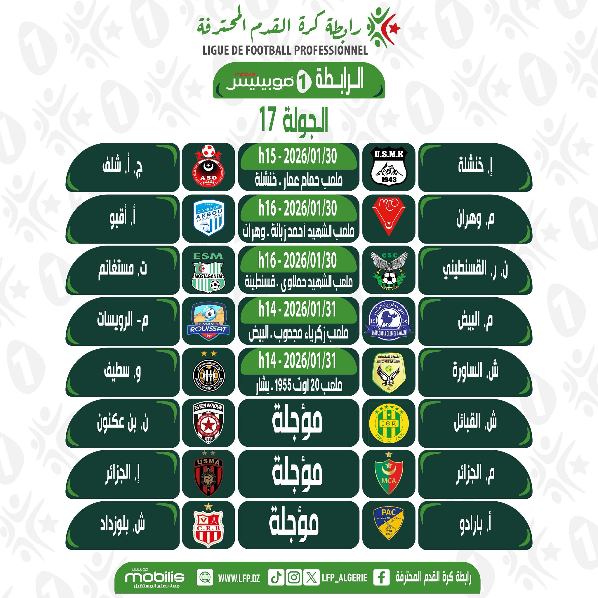 كشفت رابطة كرة القدم  المحترفة عن برنامج الجولة الـ17 من الرابطة الأولى.