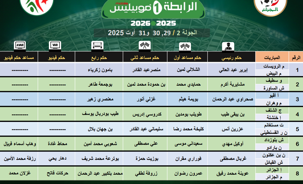 كشفت اللجنة الفيدرالية للتحكيم، عن حكام مباريات الجولة الثانية من الرابطة المحترفة الأولى.