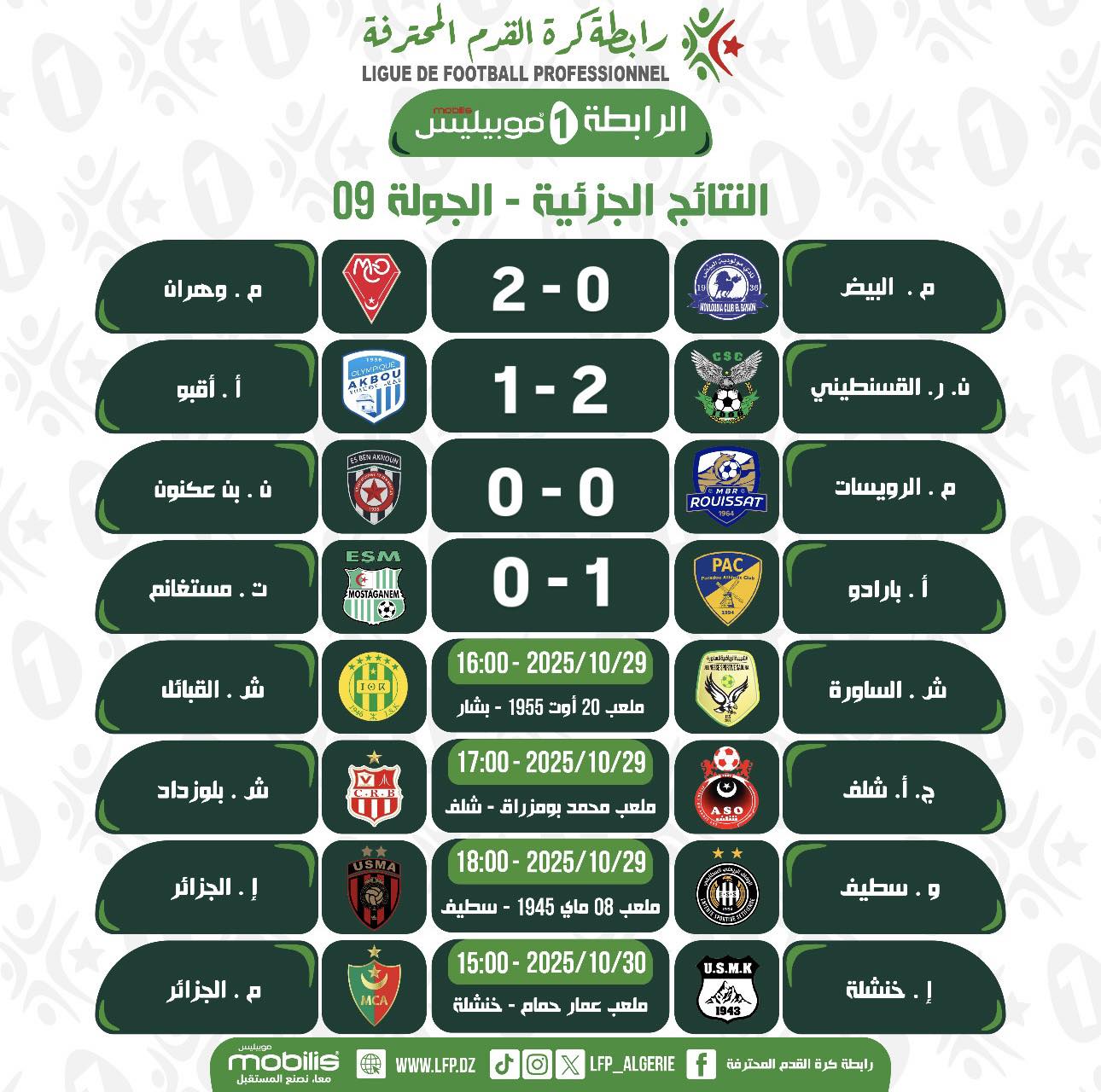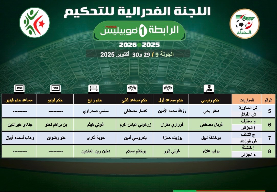 عيّنت اللجنة الفيدرالية للتحكيم حكام المباريات المتبقية من الجولة التاسعة، من الرابطة المحترفة الأولى.