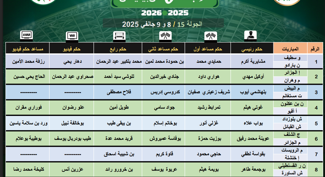 عيّنت اللجنة الفيدرالية للتحكيم، حكام الجولة الـ15 والأخيرة من مرحلة الذهاب.