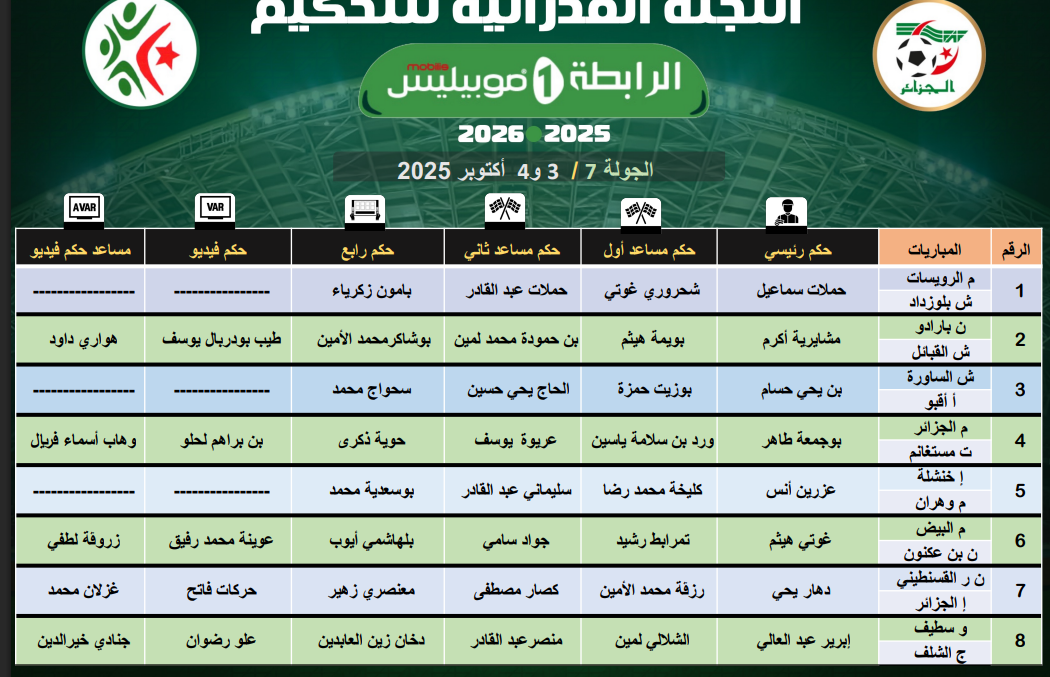 عيّنت اللجنة الفيدرالية للتحكيم، حكام مباريات الجولة السابعة من الرابطة المحترفة الأولى.