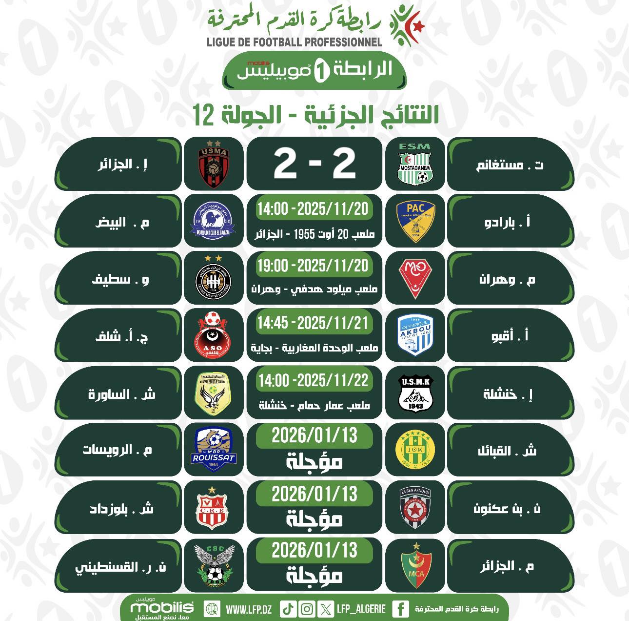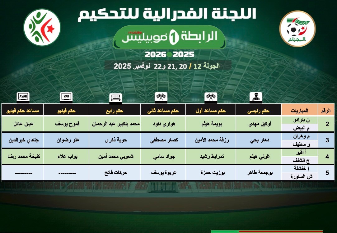عيّنت اللجنة الفيدرالية للتحكيم، حكام مباريات الجولة الـ12 من الرابطة المحترفة الأولى.