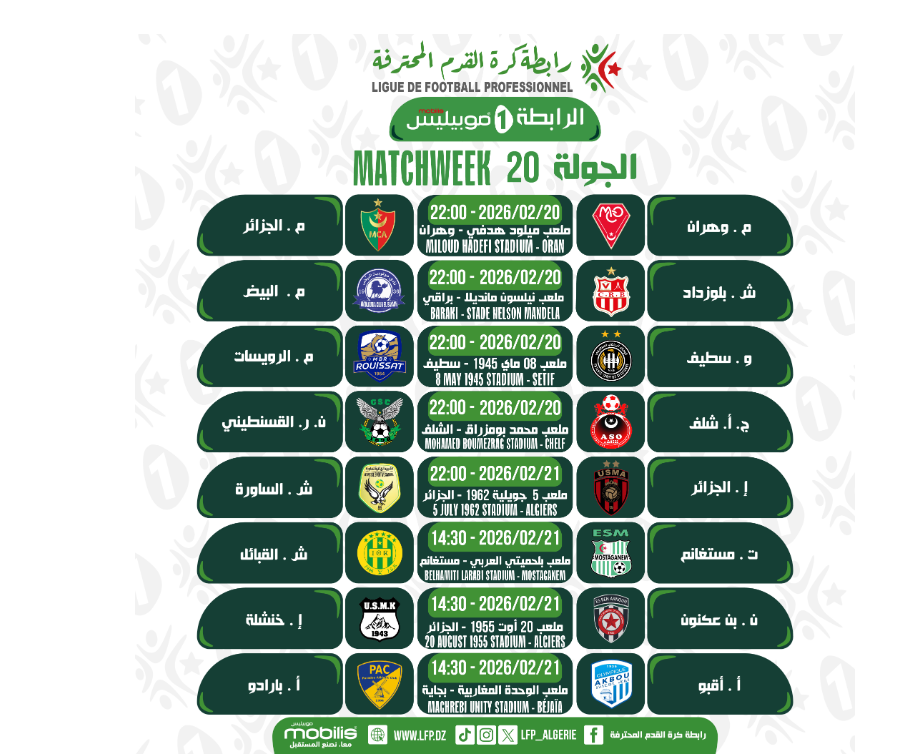 أعلنت رابطة كرة القدم المحترفة، عن برنامج الجولة العشرين من الرابطة الأولى.
