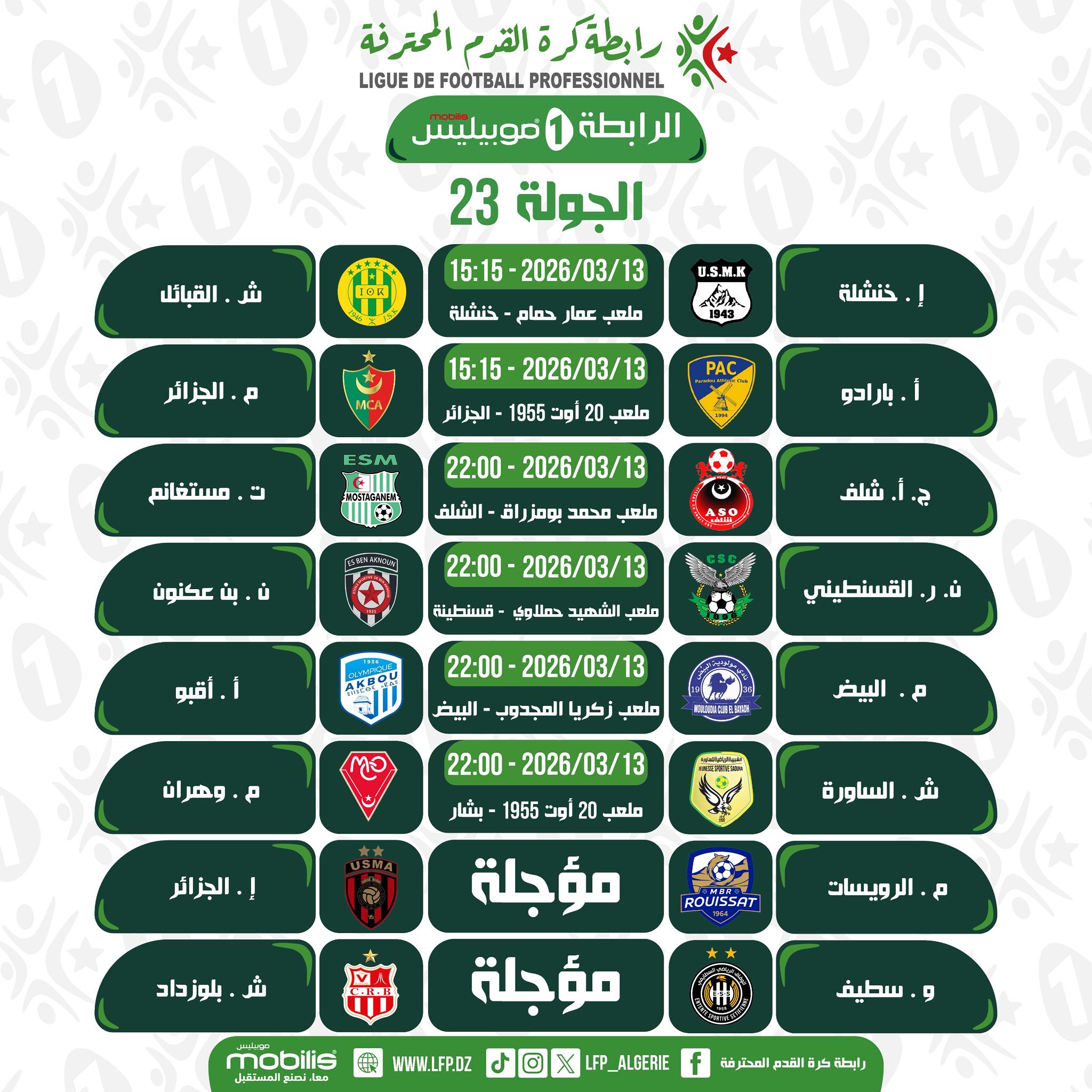 كشفت رابطة كرة القدم المحترفة عن برنامج ومواقيت مباريات الجولة الـ23 من الرابطة المحترفة الأولى.