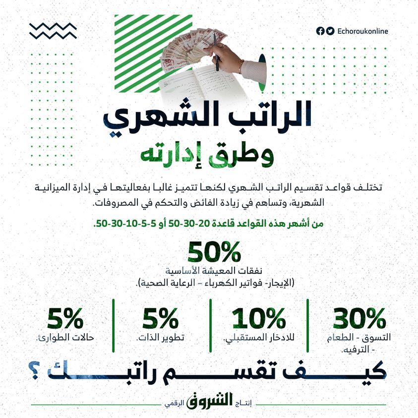 تختلف قواعد تقسيم الراتب الشهري لكنها تتميز غالبا بفعاليتها في إدارة الميزانية الشهرية، وتساهم في زيادة الفائض والتحكم في المصروفات.. فهل لديكم
