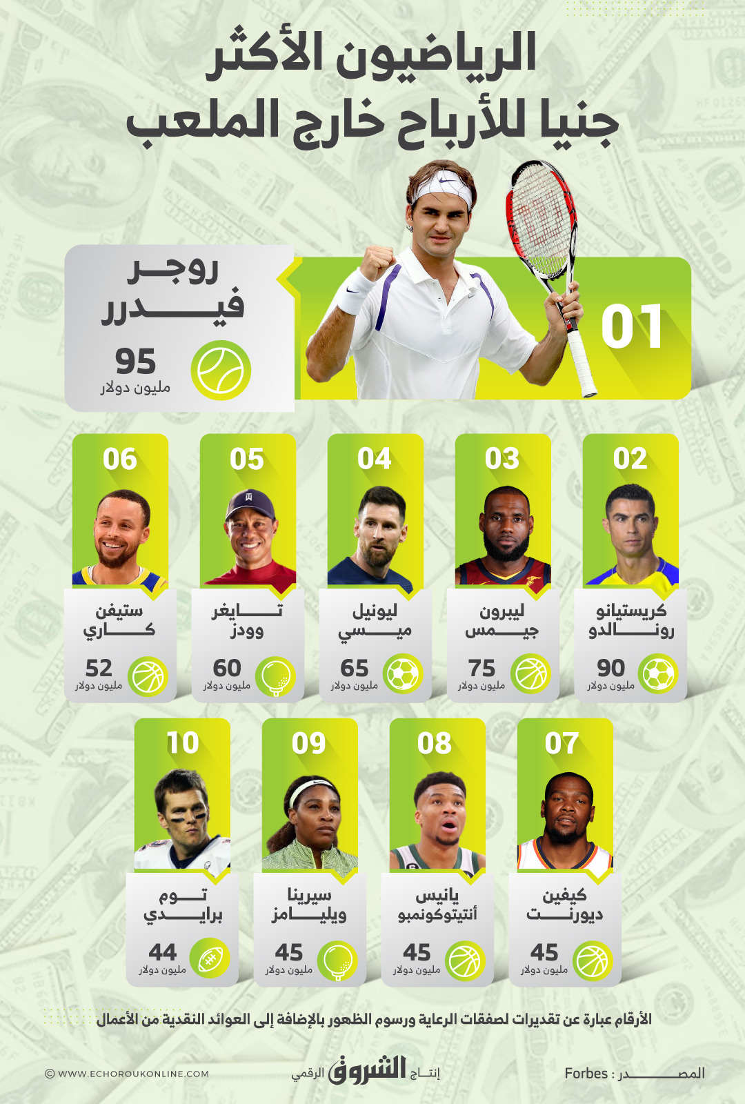 فيدرر في الصدارة.. أعلنت مجلة “فوربس” الأميركية، عن قائمة أكثر 10 رياضيين جنيا للأرباح خارج الملعب في العام الماضي، وشهدت القائمة تواجد