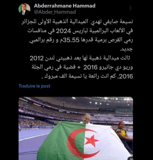 من جهته، قدّم وزير الشباب والرياضة عبد الرحمان حمّاد تهانيه للبطلة البارالمبية نسيمة صايفي.