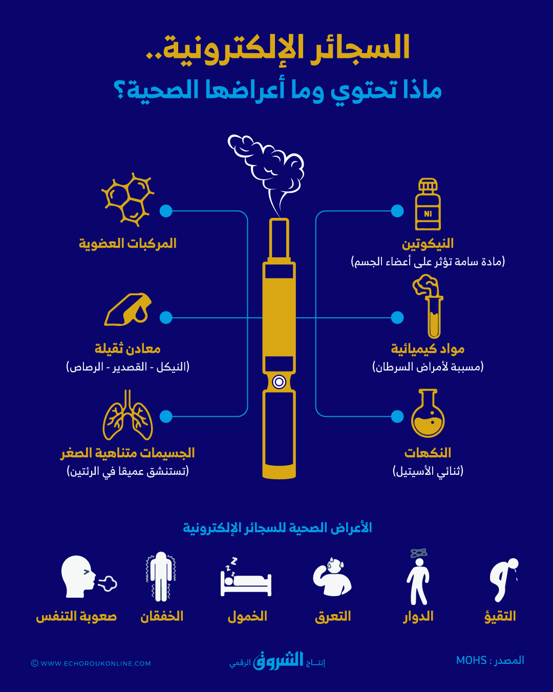 تحتوي السجائر الإلكترونية على مواد مختلفة تضر بالرئتين، وتؤثّر على الدماغ، ثم باقي أعضاء الجسم.. تعرّف إلى المزيد حول السجائر الإلكترونية،