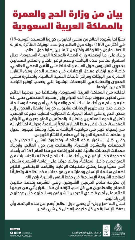 وقالت الوزارة في بيان لها، أنه تقرر إقامة حج هذا العام بأعداد محدودة جدًا للراغبين في أداء مناسك الحج لمختلف الجنسيات من الموجودين داخل المملكة، وذلك حرصًا على إقامة الشعيرة بشكل آمن صحيا وبما يحقق متطلبات الوقاية والتباعد الاجتماعي اللازم لضمان سلامة الإنسان وحمايته من مهددات هذه الجائحة، وتحقيقًا لمقاصد الشريعة الإسلامية في حفظ النفس البشرية.