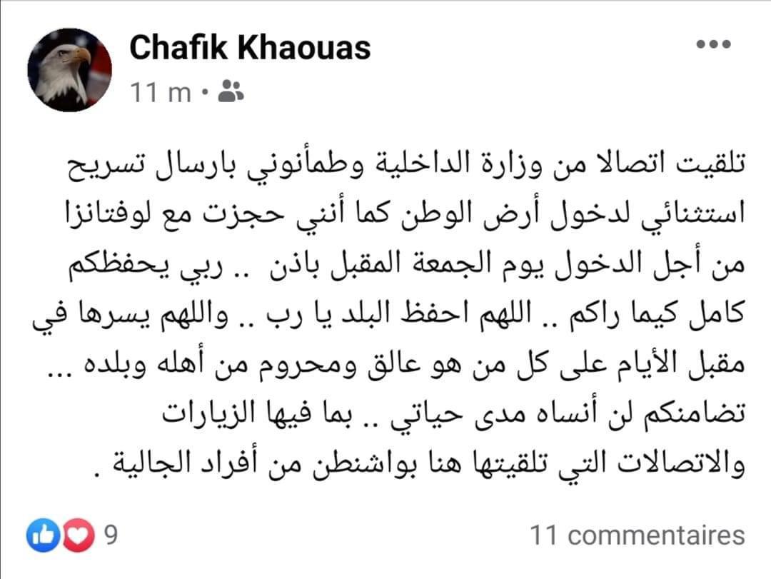 وقال الصحفي في مقطع مصور، نشره على حسابه فيسبوك إنه تلقى اتصالا من وزارة الداخلية من أجل التكفل بحالته، ووجه جزيل الشكر لكل من دعمه وتضامن معه في محنته، كما قال في منشور خاص بأنه من المقرر أن يدخل الجمعة المقبل بإذن الله لأرض الوطن.