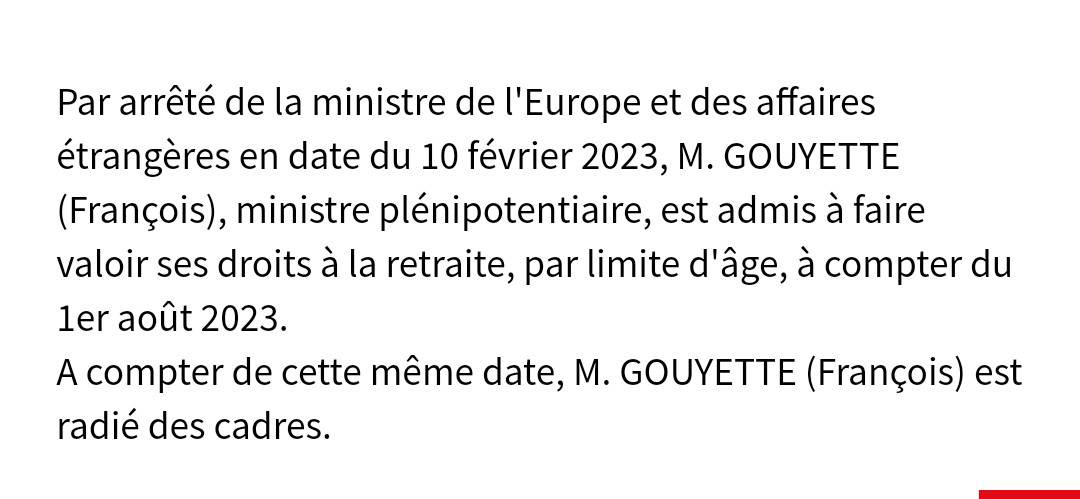 وجاء في مرسوم أصدرته الخارجية الفرنسية في الجريدة الرسمية بتاريخ 10 فيفري أن غويات أحيل على التقاعد بسبب عامل السن وسيصبح ابتداء من 1 أوت القادم خارج السبك الدبلوماسي.