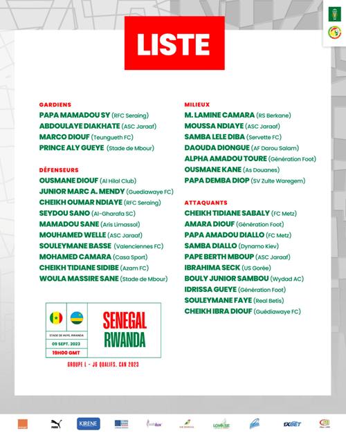 وكلّف أليو سيسي مُدربَي السنيغال لِفئتَي المحلّيين والأواسط، بِإعداد قائمة لاعبي مواجهة رواندا. استنادا إلى أحدث بيان لِاتحاد الكرة المحلّي.