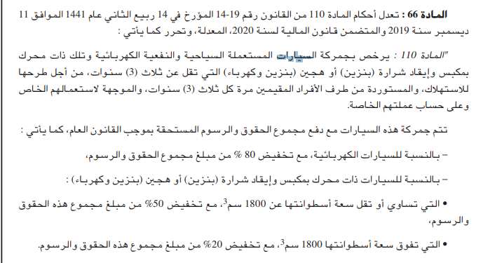 تخفيض 50% من مبلغ مجموع هذه الحقوق والرسوم على السيارات التي تساوي أو تقل سعة أسطوانتها عن 1800سم3،