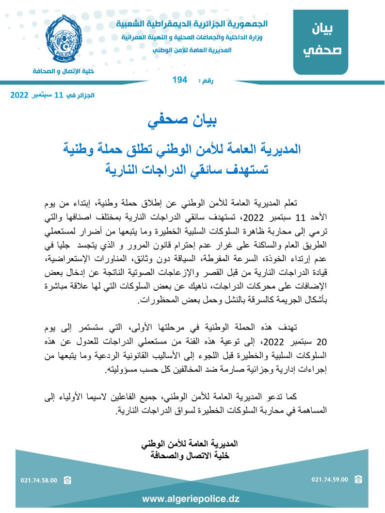 كما دعت المديرية العامة للأمن الوطني، جميع  الفاعلين لاسيما الأولياء إلى المساهمة في محاربة السلوكات الخطيرة لسواق الدراجات النارية.