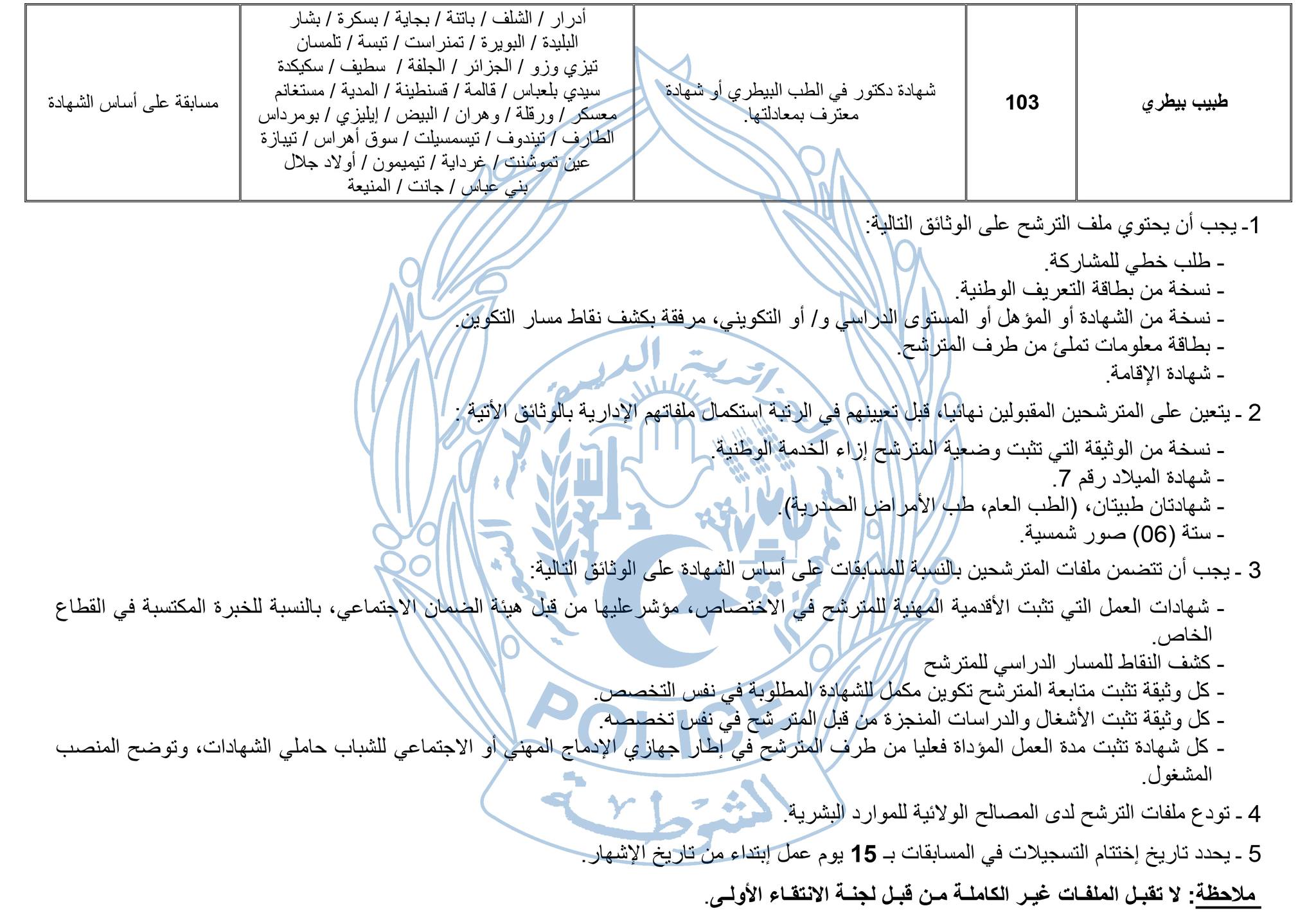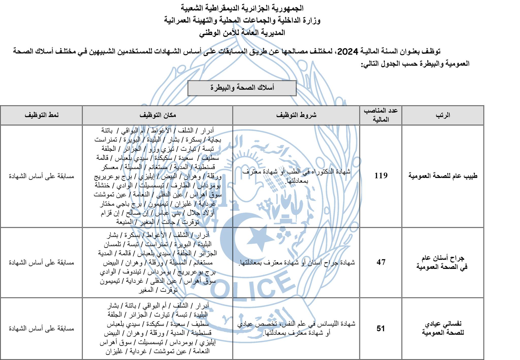 وحسب بيان لمديرية الأمن فإن مسابقة التوظيف تخص المستخدمين الشبيهين في مختلف أسلاك الصحة العمومية والبيطرة.